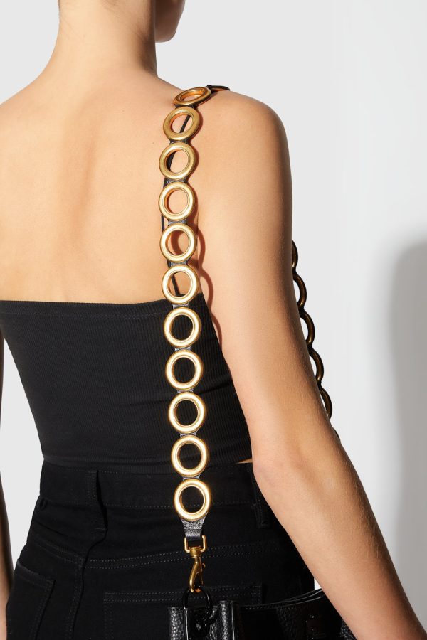 Give your handbag a fresh update with our new antique brass Guitar Strap crafted from premium leather and made bold with eyelet embellishment.
